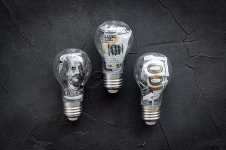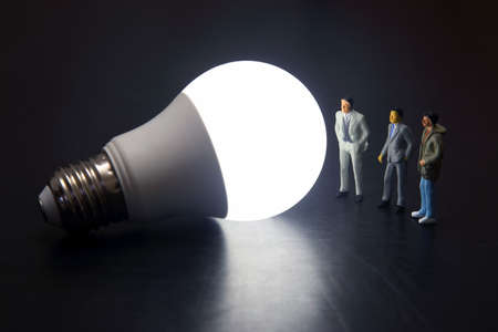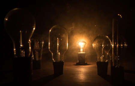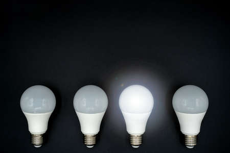 Successful idea, choice, creativity and innovation concept. Lightbulbs with copy space, one glows.