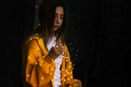 The girl is holding a Christmas garland in her hands. Preparing for Christmas. A smiling woman looks at a lit garland. Festive Illumination.
