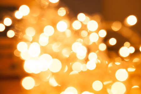 Bright Golden bokeh lights garland background. New year and Christmas. Abstract holiday black background.