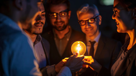 An engaging moment where one businessman presents a glowing lamp to his colleagues, their faces illuminated by the light, representing the sharing and nurturing of a new concept within the team.