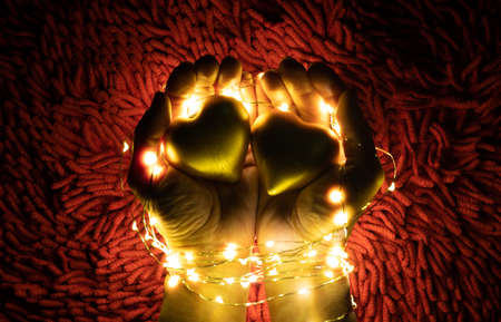 A warm color light garland surrounding two hands holding hearts. valentine's day.