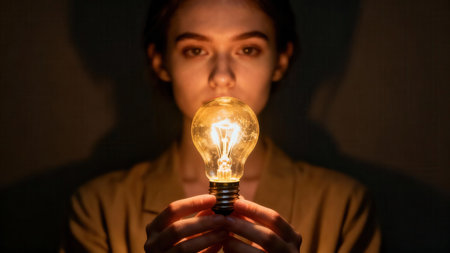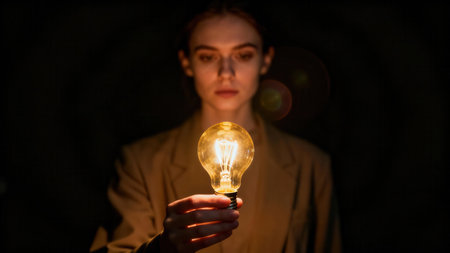 Serious young woman holding a glowing warm-toned incandescent light source against a deep black background, symbolizing focus, solution, and high contrast illumination.