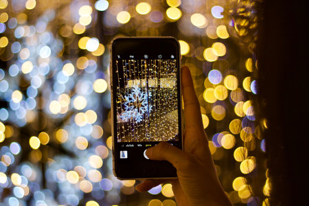 An unrecognizable woman takes pictures of colorful lights on a tree in a Park on a dark background on her smartphone in winter. Christmas light decoration. Defocused image.