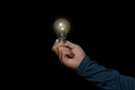 Hand holding bulb with recycle symbol inside isolate on black background.