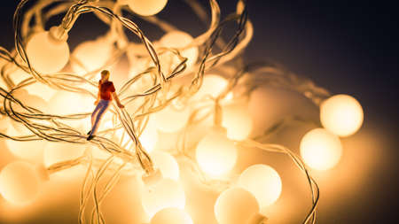 Garland of bulb lamps with modern yellow LED lighting elements, close up photo with selective focus and real photo bokeh effect