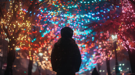 A lone figure stands at the corner gazing up at the dazzling display of lights with a look of wonder and awe on face. .