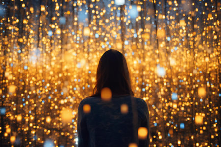Back view of a young woman in a blue dress standing in a tunnel of golden lights.