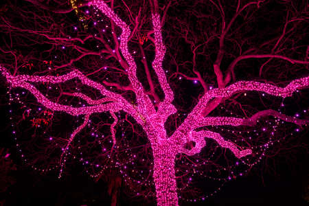 Night shot of pink light decoration on the perspective tree.