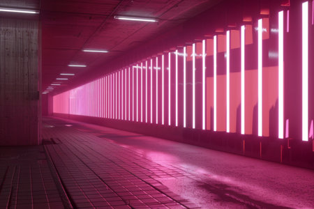A modern tunnel with glowing neon pink and blue lights, forming an abstract path that seems to stretch into infinity.