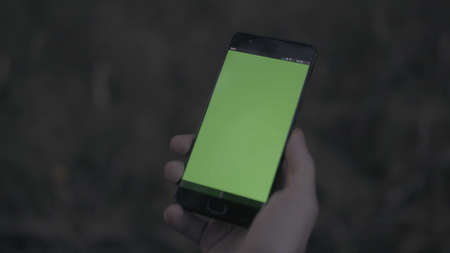 Close up of a man hand holding smartphone with green screen. Stock. Modern mobile phone with chroma key on blurred background.