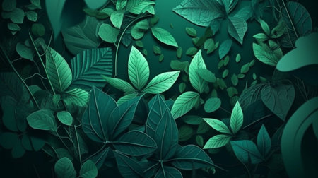 Green plant leaves natural background. Dark moody close up botanical texture. AI Generated content