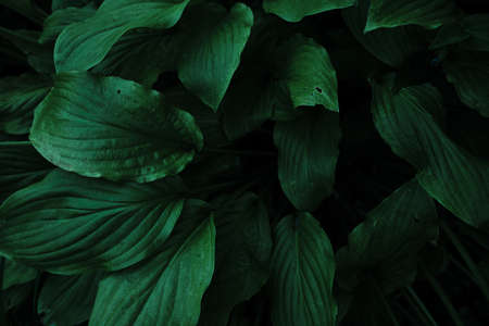 Minimalistic background with hosta leaves close - up view from above. The hosta leaves are a close-up of a bright green color. Beautiful large decorative leaves of an ever-green garden plant.