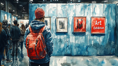 A person with a red backpack observes paintings at an art exhibition. The scene is captured in a unique watercolor style, emphasizing creativity and artistic appreciation.