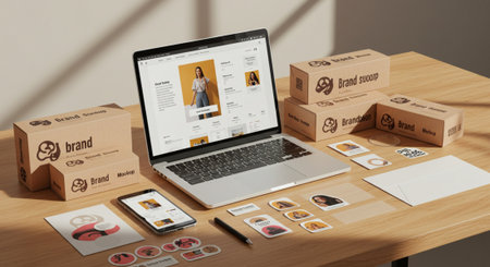 A modern workspace featuring a smartphone and various branding materials, showcasing creativity and organization in a stylish desk environment.