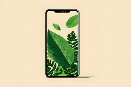 A smartphone displays a bright green leaf background, symbolizing nature and freshness. The design highlights the connection between technology and the environment, promoting eco-friendliness.