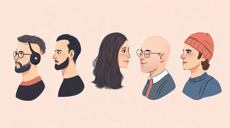 A diverse group of individuals with distinct styles and expressions standing in profile against a soft background
