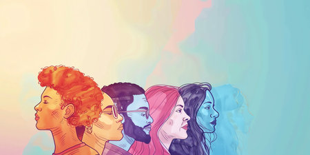Six individuals of varied backgrounds are silhouetted from the side, highlighting their unique features against a vibrant, colorful background that symbolizes diversity and connection.
