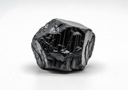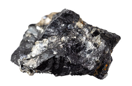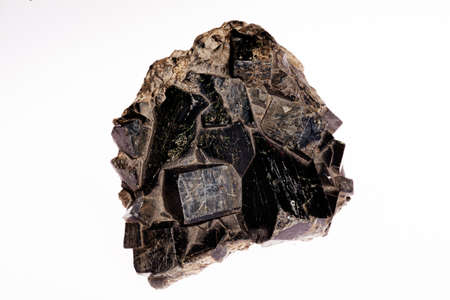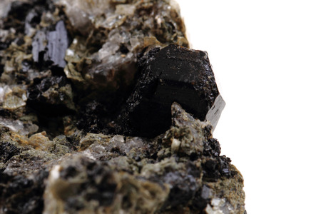 macro mineral stone sherle, schorl, black tourmaline on white background close-up