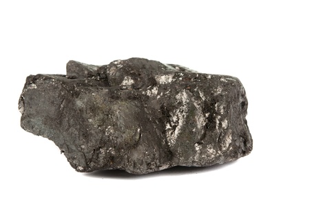 Macro Close up image of raw material Platinum and Chrome Ore rock isolated on black reflective background