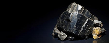 Ullmannite is a rare precious natural geological stone eremite on a black background in low key. Fashionable jewelry elegant decoration. AI generated. Header banner mockup with space.