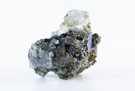 Natural fluorite stone with pyrite golden specks and galena lead glance crystal, a geological sample from Russia photographed on white background.