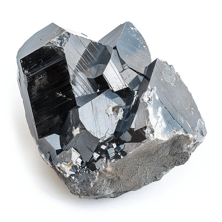 A single, unrefined specimen of a metallic mineral, showcasing its natural crystalline structure and brilliant, reflective luster. Isolated on a clean white background, this image highlights the raw beauty and industrial potential of geological resources, perfect for scientific, educational, or metallurgical themes.
