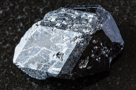 sample of raw melanite andradite black garnet crystal on black granite background close up from Kazakhstan