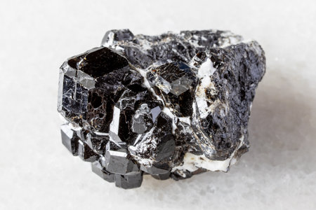 sample of rough druse of melanite andradite black garnets on white marble background close up from Krasnoyarsk region, Russia