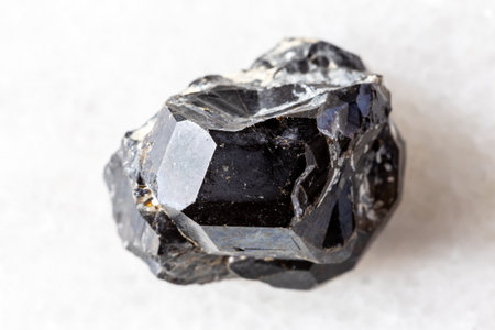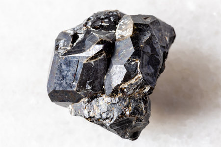 sample of unworked melanite andradite black garnet crystal on white marble background close up from Kazakhstan