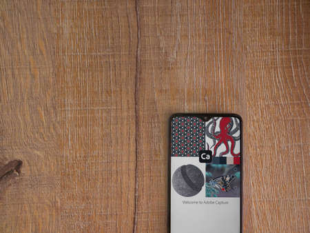 Lod, Israel - July 8, 2020: Adobe Capture - Vector and Pattern Maker app launch screen with logo on the display of a black mobile smartphone on wooden background. Top view flat lay with copy space.