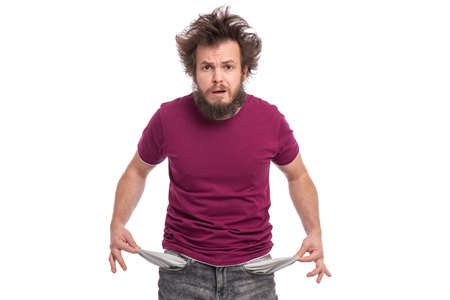Crazy bearded Man with funny Haircut showing his empty pockets, turning his pockets inside out. Portrait of sad Guy, isolated on white background. Unhappy face expression. Money concept.
