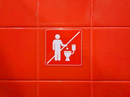 A sticker on the red tile in the toilet about the prohibition of throwing garbage into the toilet.