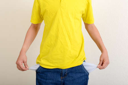 Inverted empty pockets. The young man turned out empty jeans pockets. A lack of money. Financial difficulties