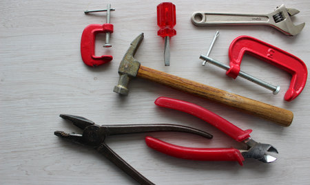 Various hand tools for build and repairing on working table.