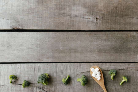 Vitamin or medicine capsules, broccoli on wooden spoon on wooden background. Health therapy or treatment concept. Vitamin pills. High quality photo