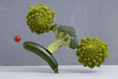 Fresh green vegetables on the table. zucchini, Romanesco broccoli, cherry tomato, Floating food balance concept, levitation.