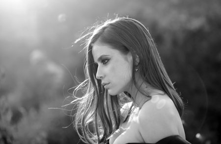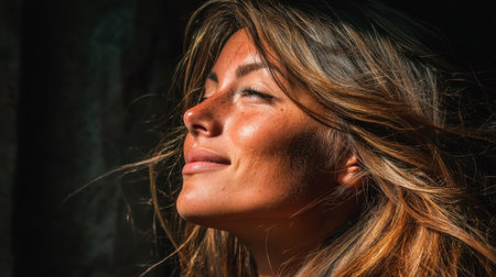 Woman with flowing hair enjoys sunlight, her face illuminated with warm glow. soft breeze adds sense of freedom and joy to moment, capturing serene expression