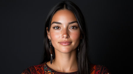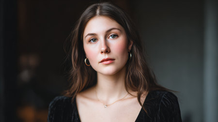Portrait of a young woman with freckles and long dark hair