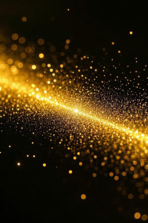 Christmas light and glow background. Abstract glitter bokeh and scattered sparkles in gold, on black
