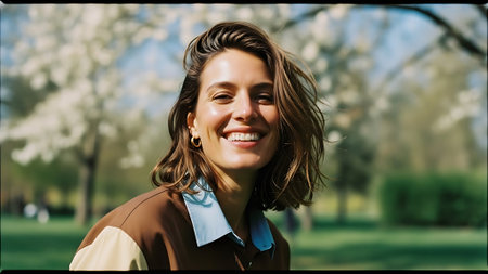 A joyful woman radiates happiness as she stands outdoors under the sunlight. Her flowing hair dances in the breeze, capturing a moment of pure delight.