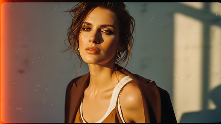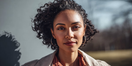 A young woman with curly hair poses confidently against a simple background on a bright day. Her expression shows strength, and the sunlight highlights her features beautifully.