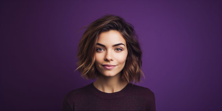 Portrait of a beautiful young woman with long hair on a purple background