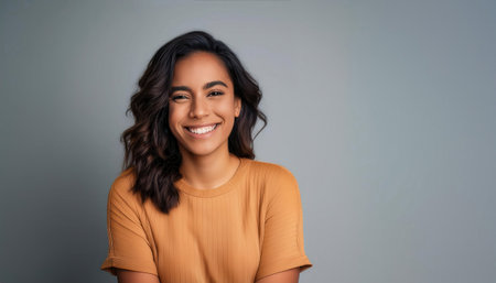 Joyful and Grateful Young Woman Portrait, Confidently Smiling at Camera on Simple Background.