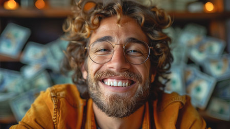 Close-up, happy man against a background of dollar bills.
