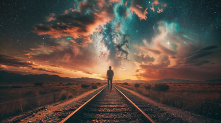 A solitary figure walking along a railway track at sunset, with a dramatic sky full of colorful clouds and stars.