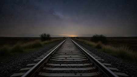 An image showcases railroad tracks extending into the distance under a dusky sky. The composition emphasizes perspective, with the tracks converging towards the horizon. The landscape is characterized by natural elements and a subdued palette. This scene could be suitable for various uses, including editorial and commercial projects.