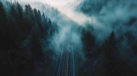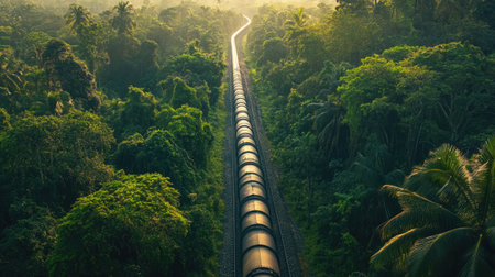 A captivating aerial view of a train traveling through a dense jungle, surrounded by vibrant greenery and early morning fog, evoking a sense of adventure.