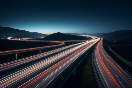 An overhead perspective reveals a complex highway interchange illuminated at night. Streaks of light trace vehicle movement across curved roadways. The composition highlights the flow of transportation against a backdrop of dark vegetation. This image may be suitable for various commercial or editorial applications.
