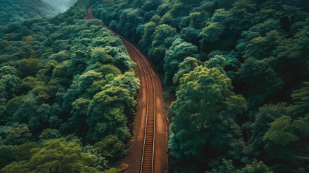 From a bird's eye view, a train snakes through a lush and verdant forest, surrounded by towering trees and a natural landscape. AI Generative AI.