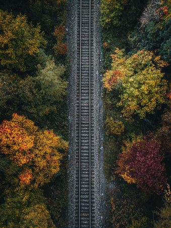 The railway tracks stretch through a serene landscape, bordered by golden-yellow trees, creating a striking contrast against the deep green forest backdrop during autumn.